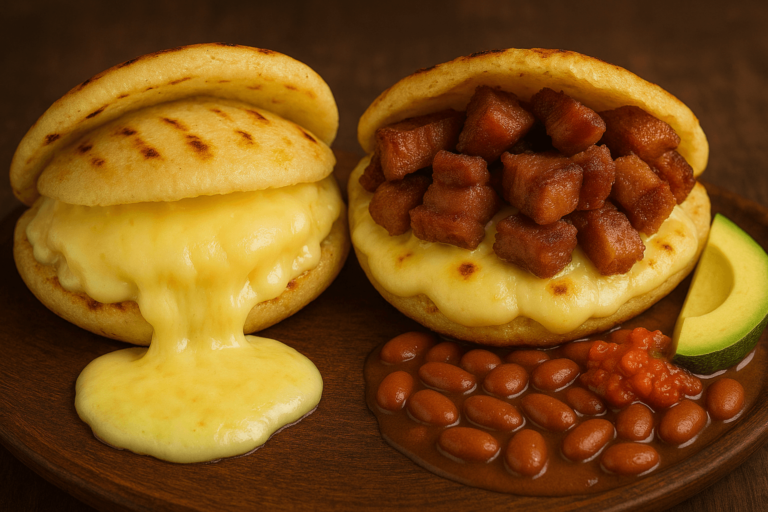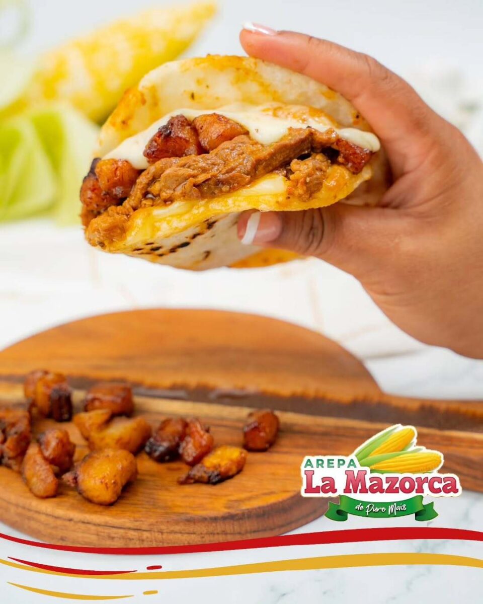 Arepa stuffed with crispy pork belly, homemade beans, golden sausage, sweet plantains, and melted cheese. A burst of tradition and flavor that takes you straight to the streets of Colombia